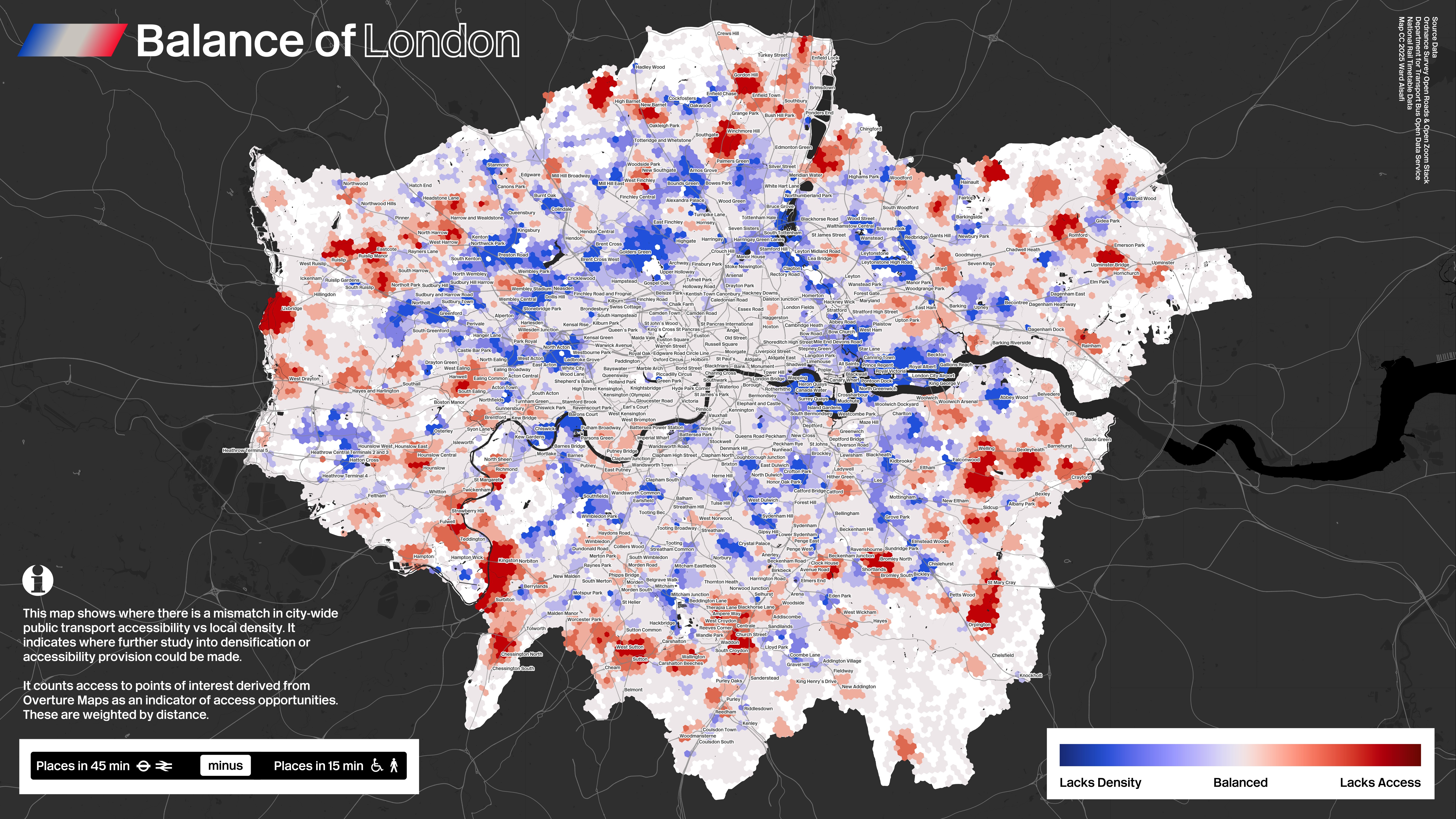 For example: if an area has a lot of local jobs compared to other parts of London but has relatively little access to city-wide jobs, it could benefit from more accessibility. If an area has great city-wide connectivity to jobs but locally is quite sparsely populated by jobs, it could benefit from more local development and investment.